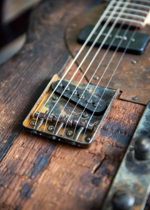 building which was constructed in 1890. The pickguards were fabricated from the bars copper top. One guitar is
